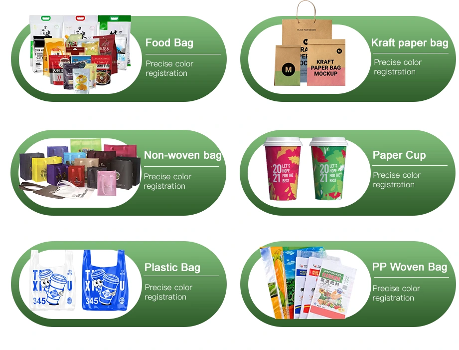 Geschikt voor PE, BOPP, PET, CPP, papier en andere flexibele substraten, ideaal voor voedselverpakkingen, boodschappentassen, etiketten en diverse flexibele verpakkingen.